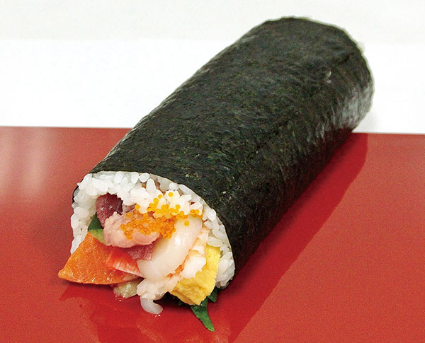 酢飯(米(国産)、調味酢)、まぐろすき身、サーモン、ほたて貝柱、厚焼玉子、まぐろ加工品、いか、寿司えび、かに風味かまぼこ、穴子、きゅうり、とびこ、乾燥のり、大葉/増粘剤(加工澱粉、カラギナン)、調味料(アミノ酸等)、pH調整剤、炭酸Ca、ソルビット、香料、酸味料、カロチノイド色素、乳化剤、酸化防止剤(V.C)、(一部にえび・かに・小麦・卵・いか・さけ・大豆を含む。)栄養成分表示(1本当り)/熱量835kcal、たんぱく質56.2g、脂質14.6g、炭水化物116.0g、食塩相当量3.9g(推定値)