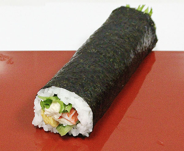 酢飯(米(国産)、調味酢)、厚焼玉子、ツナマヨ、カニ風味かまぼこ、きゅうり、フリルレタス、乾燥のり/増粘剤(加工澱粉、増粘多糖類)、調味料(アミノ酸等)、pH調整剤、酸味料、炭酸Ca、ソルビット、香料、カラメル色素、カロチン色素、乳化剤、香辛料、(一部にえび・かに・小麦・卵・乳成分・大豆・ゼラチンを含む。)栄養成分表示(1本当り)/熱量426kcal、たんぱく質13.3g、脂質7.4g、炭水化物75.4g、食塩相当量2.5g(推定値)