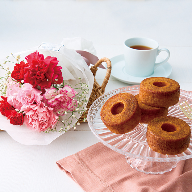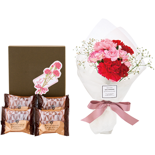 可愛らしいカーネーションとのセット。しっとりとしたバームクーヘンにカラメルソースをまとわせ、砂糖をかけて焼き上げた逸品です。