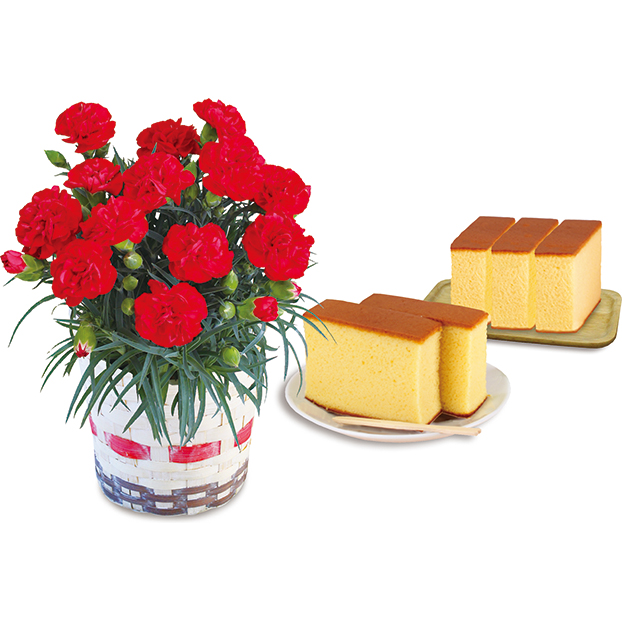 カーネーション4号鉢としっとりと焼き上げた蜂蜜かすてらをセットにしました。※カゴのデザインが変更になる場合がございます