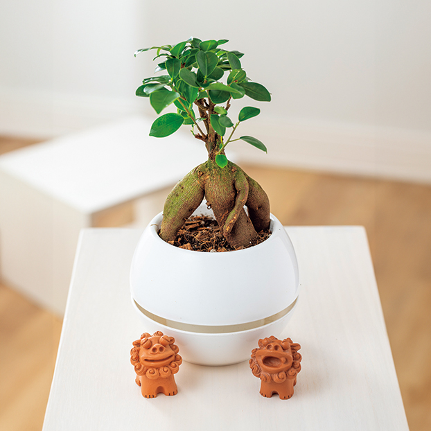 ガジュマルとシーサー像をセットした室内観葉です。ガジュマルは、やや肉厚で光沢のある葉と独特な姿で人気です。